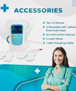 - The TENS 1.0 kit is included with 1 TENS 1.0 device || 4 Reusable Self-adhesive Electrode Pads || 2 Lead Wires || 1 USB Charging Cable || 1 Instruction Manual.